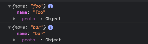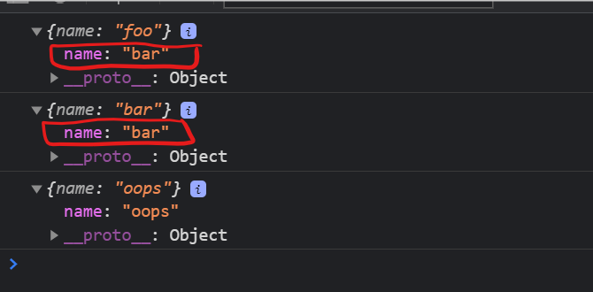 Notice how the first object name is no longer "foo", but rather "bar". The same happens when you are using console.dir and console.log({x}). The last log is because we reset the reference with a new object, which is not practical.